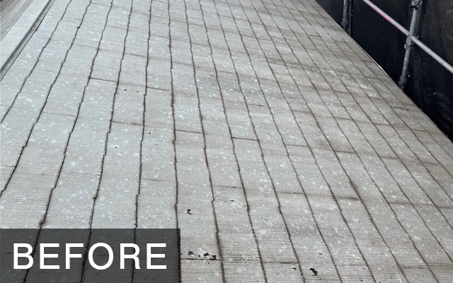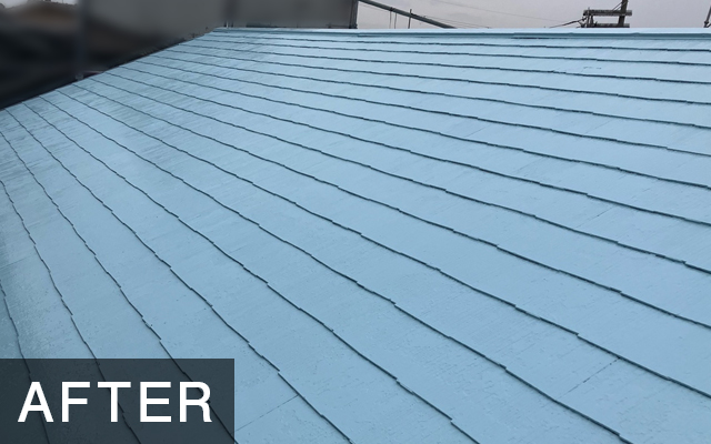 ● ご提案・施工内容 スレート屋根の塗り替え工事。遮熱効果のある弱溶剤型シリコン樹脂系塗料を塗りました。 鮮やかな水色により、さわやかで明るい印象に変化しました。 屋根 パラサーモ(日本特殊塗料) 色 エコライトブルー