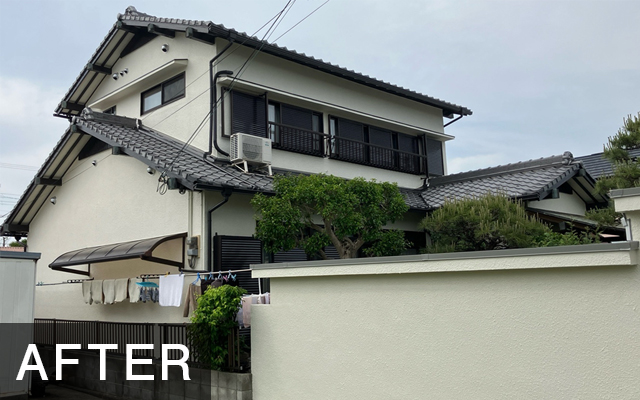 ● ご提案・施工内容 外壁の塗装にラジカル制御超耐候型水性ハイブリッドシリコン樹脂塗料を使用しました。 各部、もともとのお家の印象を活かし、さらに美しく仕上げました。 外壁 プレミアムシリコン(エスケー化研) 色 5分艶 SR-163 軒天 水性ケンエース(日本ペイント) 色 5Y9.2/1(25-92B) 木部・樋 1液ファインウレタンU100(日本ペイント) 色 破風チョコ 玄関 キシラデコール(大阪ガスケミカル) 色 オリーブ