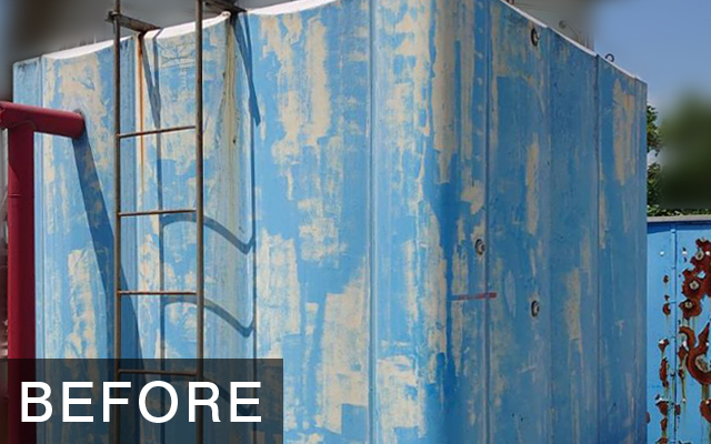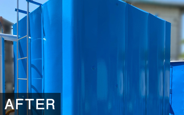 ● ご提案・施工内容 貯水槽の外面に、超低汚染形ターペン可溶2液形アクリルシリコン樹脂塗料を塗りました。 見た目がきれいになるだけでなく、太陽光から貯水槽を守る効果があります。 貯水槽 ファインシリコンフレッシュⅡ(日本ペイント) 色 L69-50T