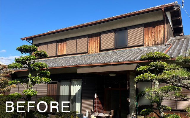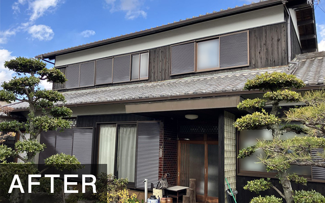 ● ご提案・施工内容 もともとのお家(和風)の印象を活かし、各部、美観を高めました。 杉板外壁 キシラデコール 色 エボニ モルタル壁 エスケープレミアムシリコン(エスケー化研) 色 3分艶 SR-103 破風板・垂木 1液ファインウレタンU100(日本ペイント) 色 破風チョコ 雨戸 ファインSi(日本ペイント) 色 破風チョコ