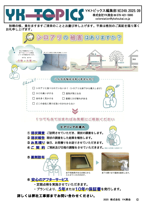 YKトピックス 25.09号 ←「記事」をクリックして本文を入力してください。トップへもどる その他のニュース 2025-10-16 YKトピックス 25.09号 お家の事なら何でも相談下さい!! 白アリ駆除もやってます。 2025-09-17 YKトピックス 25.08号 マスキングテープの色々! 2025-08-19 YKトピックス 25.07号 窓リフォームキャンペーン!! 2025-07-07 YKトピックス 25.06号 熱中症対策と便利塗装グッズで快適作業!! 2025-06-09 YKトピックス 25.05号 "WBCT(暑さ指数)に基づいた熱中症対策が義務化"「黒球式熱中症指数計」 お知らせ一覧新着情報YKトピックス Calendar Loading