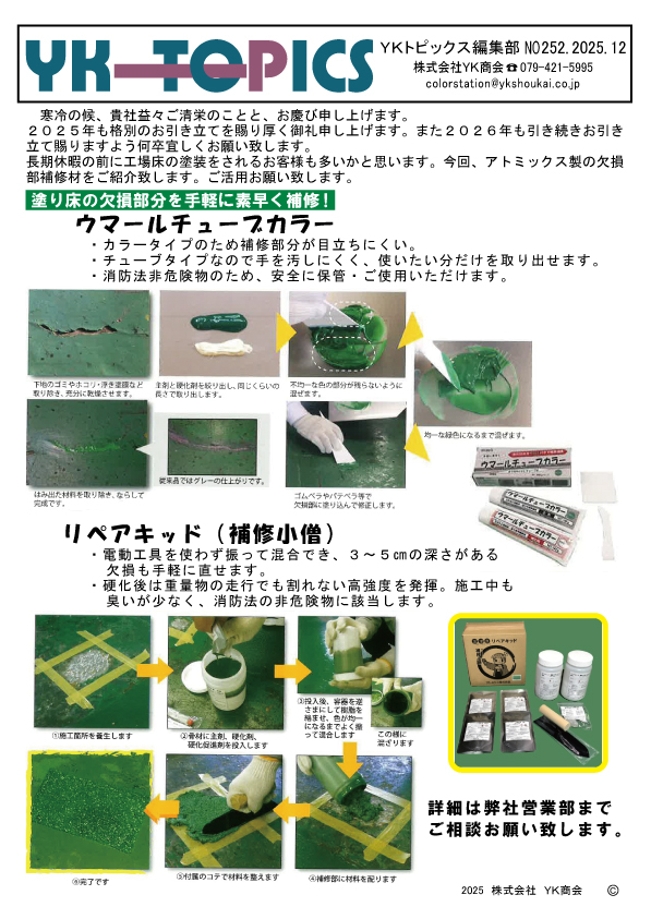 YKトピックス 25.12号 ←「記事」をクリックして本文を入力してください。トップへもどる その他のニュース 2026-01-16 YKトピックス 25.12号 塗り床補修材「ウマール」「リペアキッド」 2025-12-17 YKトピックス 25.11号 強靭な塗膜「KFタイルホールド工法」 2025-10-16 YKトピックス 25.09号 お家の事なら何でも相談下さい!! 白アリ駆除もやってます。 2025-09-17 YKトピックス 25.08号 マスキングテープの色々! 2025-08-19 YKトピックス 25.07号 窓リフォームキャンペーン!! お知らせ一覧新着情報YKトピックス Calendar Loading